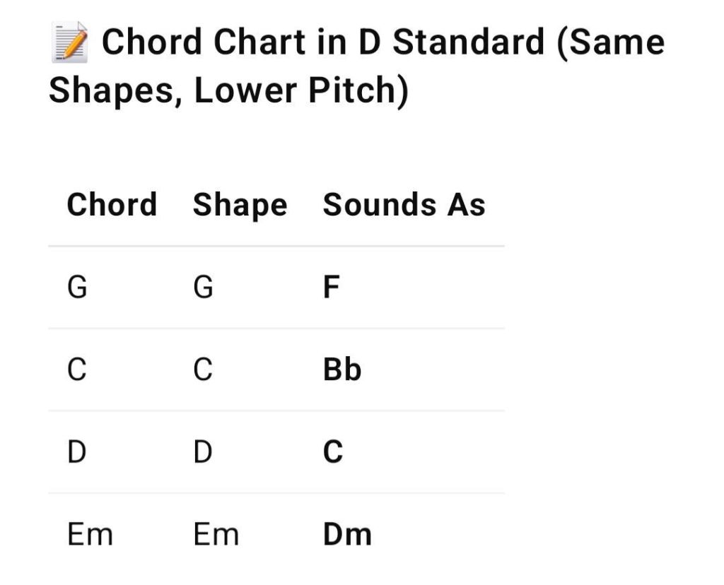 📝 Chord Chart in D Standard (Same Shapes, Lower Pitch)